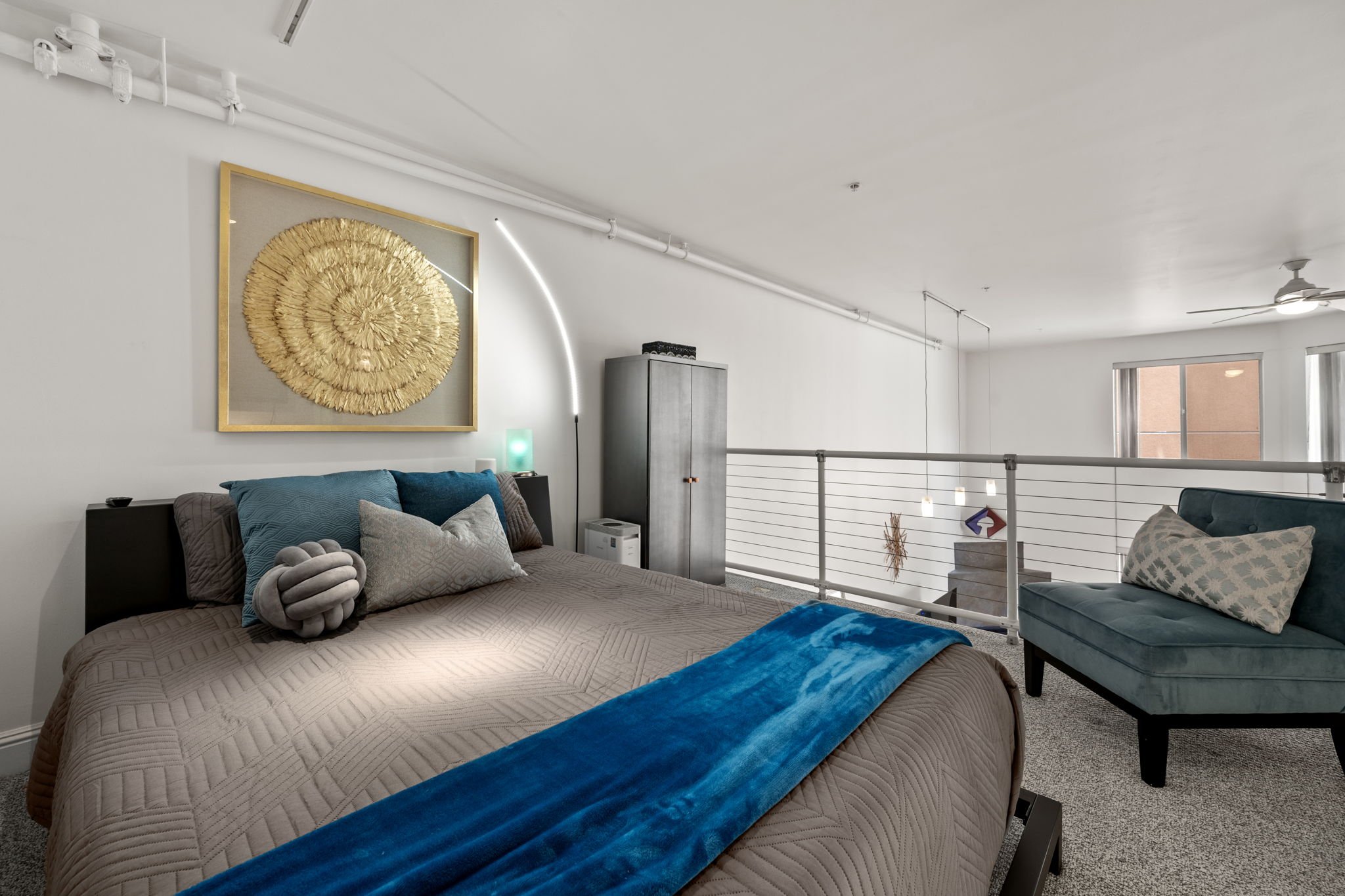 Head upstairs to explore the carpeted owner's suite loft, featuring a king-size sleeping area and an oversized walk-in closet with rows of shelving and hanging space. The en suite bathroom features a stylish open vanity with a vessel sink, plus a private water closet and wet room rain shower finished with a linear drain, sprayer and shampoo niches. Open wire handrails provide views through the great room windows, while frosted glass doors allow light to roam throughout. A deeded garage parking space with storage and EV-ready wiring completes this move-in ready SoMa showplace.