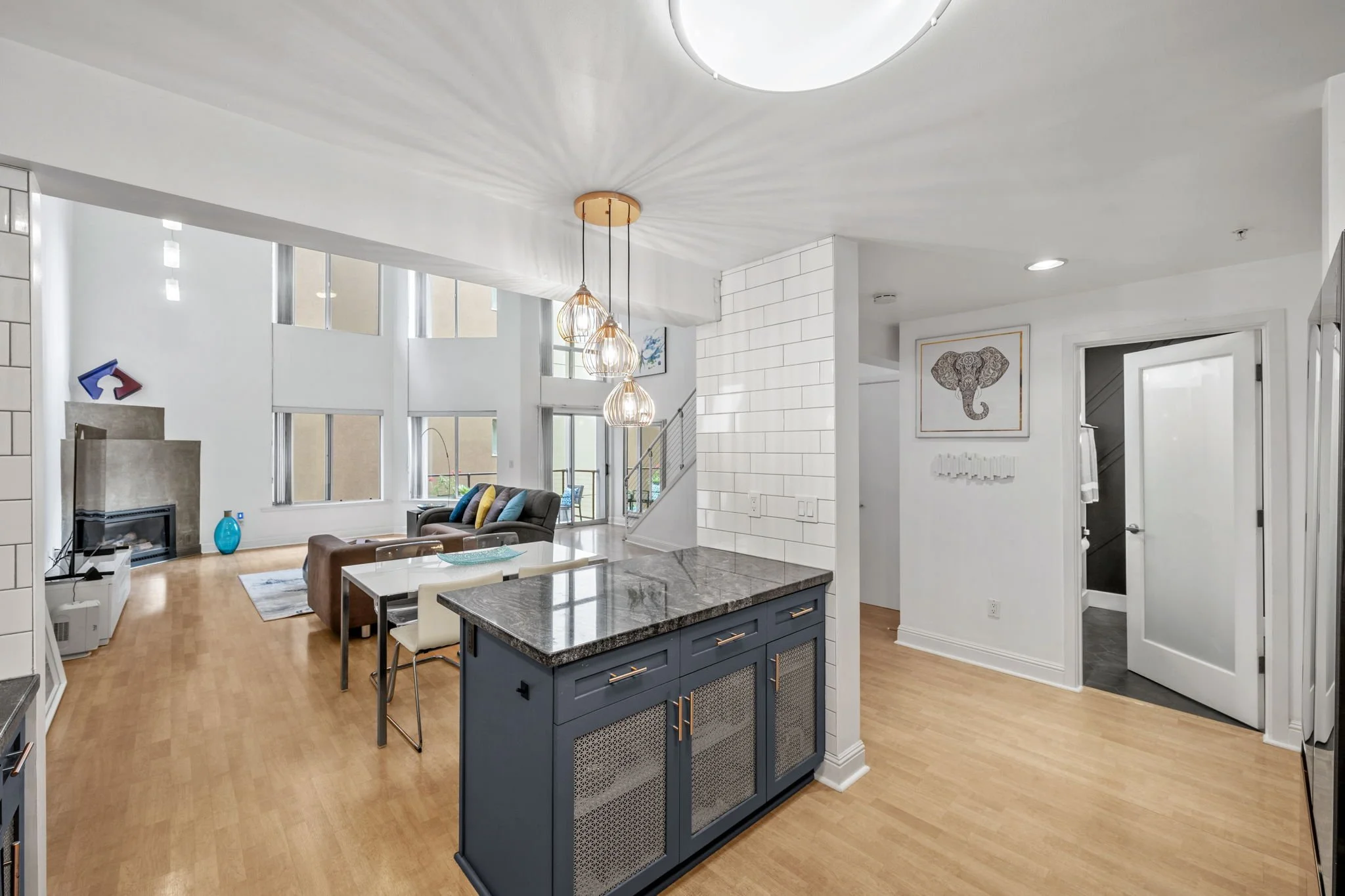 Tastefully remodeled 1,061-square-foot interiors featuring double-height ceilings, designer lighting and rows of oversized windows.
